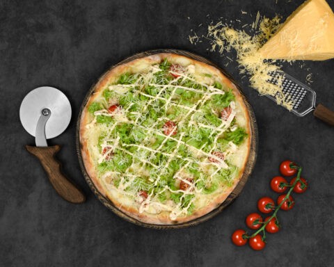 Фирменный томатный или сливочный соус, Моцарелла, курица копченая, соус чили, пармезан, соус дор блю